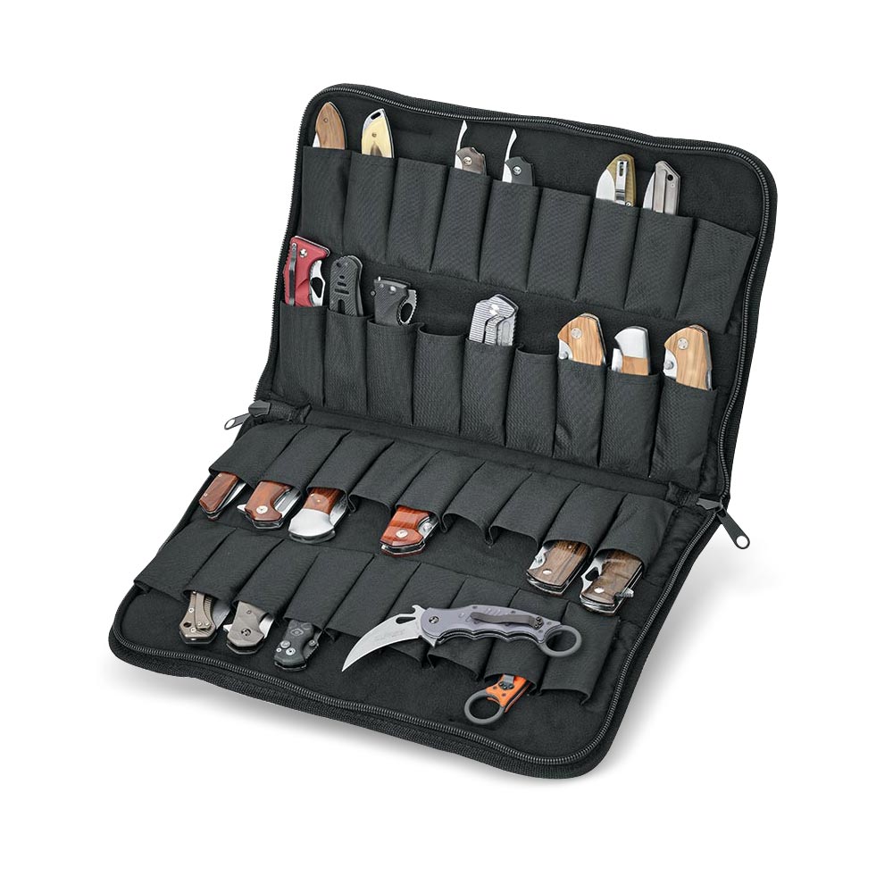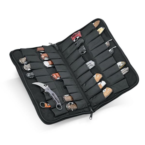 FOX Knives Folding Knives Organizer 36 slots is made of very durable ballistic nylon, resistant to moisture and dust. It has a double-sided zipper and comfortable handles to carry your collection.