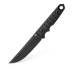 - Blade: fixed blade (full tang), trailing point style blade with flat grind, plain cutting edge
