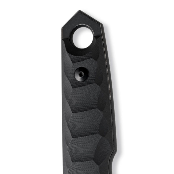 The handle of the knife is made of G10 composite. The scales were screwed to the steel structure with screws. The whole creates an ergonomic shape, additionally profiled in a way that prevents the hand from slipping onto the cutting edge during operation. The handle has a hole for a rope or paracord and it’s ended with a glass breaker or a hammer.