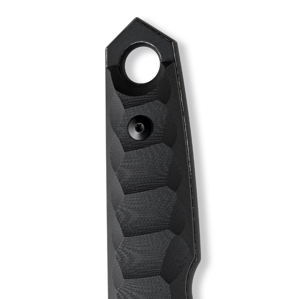 The knife has a trailing point blade and a flat griund. In application it is very versatile and convenient. The length and thickness predisposes them to perform heavier field work as well. The spine has a swedge, significantly improving penetrating properties. The jimping improves grip during heavier work. Knife is finished in black Idroglider stonewash. It is a scratch-resistant, matte non-reflective coating made of PTFE.