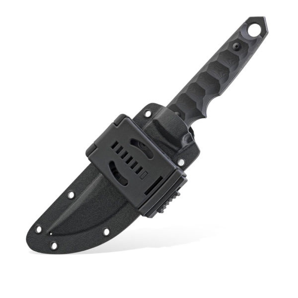 Knife comes with sheath made of Kydex. Kydex is characterized by high impact and scratch resistance, low moisture absorption, resistance to various weather conditions and many chemicals. Sheaths made of it are used comfortably and for a long time. To facilitate the removal of the knife, a thumb rest has been designed, thanks to which the knife can be removed in a controlled and safe manner. The sheath has pass-through pins to which you can attach, for example, a tinder holder (not included) or use them to attach it to a backpack. It works with the MOLLE system and a knife can be carry in different positions.