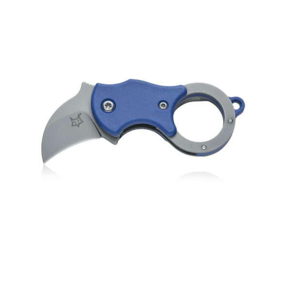 FOX Knives Mini-Ka FX-535 BL Blue Folding Knife has a karambit blade made of 1.4116 stainless steel (finish: bead blasted) and a handle made of durable FRN nylon with a blue color. The knife blade is blocked by a liner lock, and it is carried using a steel carrying clip or a pendant: a steel ring with a webbing identification patch included in the set.