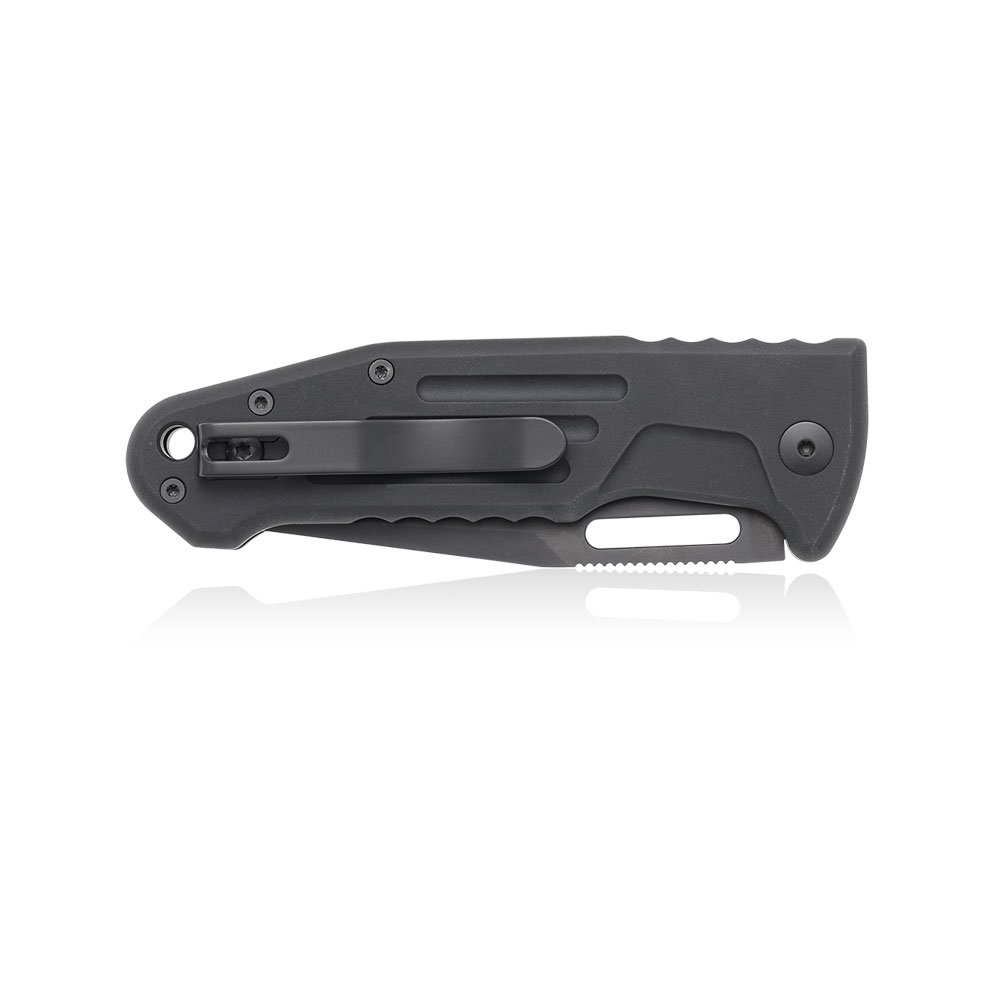 The handle is made of durable anodized and contoured aluminum. The finger groove improves grip and prevents the hand from slipping to the cutting edge. On one side of the handle, the knife has a button that releases the blade and a safety slider, on the other side there is a clip. At the end of the handle, the manufacturer placed a hole for the paracord.