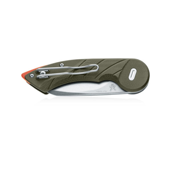 FOX Knives Radius FX-550 G10OD Folding Knife by Denis Simonutti has an N690 stainless steel blade (stone washed finish) and green G10 composite grips. The G10 backspacer is orange. Carrying the knife is supported by a steel clip in the form of a wire. The knife comes with a black nylon zippered case decorated with a removable PVC patch specially prepared for the Radius knife.