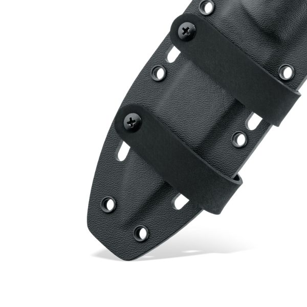 W zestawie z nożem otrzymujemy kaburę kydex’ową montowaną do paska w poziomie za sprawą dwóch pasków ją oplatających. Kydex cechuje się wysoką odpornością na uderzenia, zarysowania, charakteryzuje się niską chłonnością wilgoci, odpornością na różnorodne warunki atmosferyczne oraz wiele środków chemicznych. Kabury z niego wykonane użytkujemy wygodnie i długotrwale. Kabura zaopatrzona została w piny przelotowe, do których można przypiąć np. uchwyt na krzesiwo (nie znajduje się w zestawie) lub użyć ich do jej zamocowania na plecaku. Pochwa wyposażona została w linkę w dolnej części służącą do przywiązywania jej do nogi, dzięki czemu w trakcie marszu nóż nie obija się o udo.