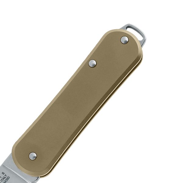 Okładki scyzoryka wykonano z mosiądzu i zakończono odcinkiem stali z otworem na smycz czy paracord, czy też kółko do kluczy.