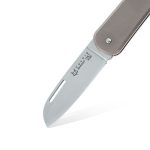 Głownia noża posiada profil sheepsfoot z płaskim szlifem i wycięciem na paznokieć dla jej łatwego otwierania. Konstrukcja scyzoryka opiera się na mechanizmie znanym jako slipjoint a otwieranie następuje oburącz.