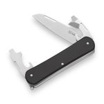 Głownia noża posiada profil sheepsfoot z płaskim szlifem i wycięciem na paznokieć dla jej łatwego otwierania. Konstrukcja scyzoryka opiera się na mechanizmie znanym jako slipjoint a otwieranie następuje oburącz.