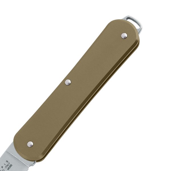 Okładki scyzoryka wykonano z mosiądzu i zakończono odcinkiem stali z otworem na smycz czy paracord, czy też kółko do kluczy.