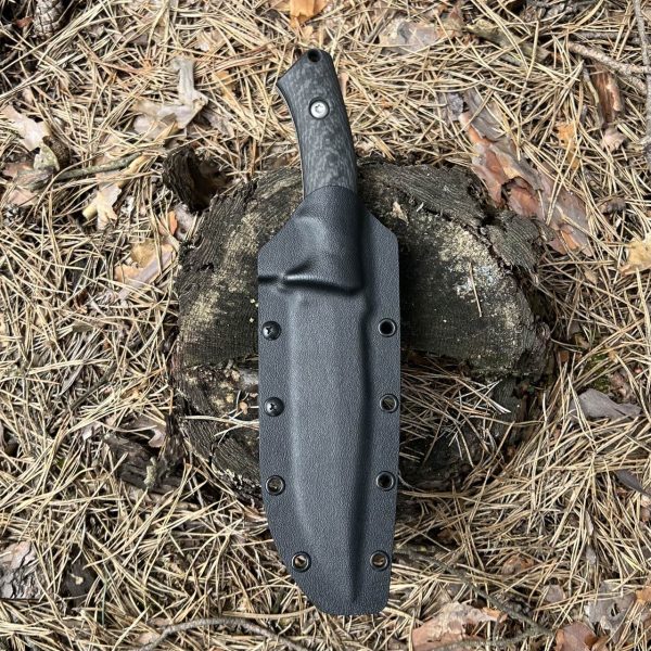 KD Knives Kamil Dlugosz Defender Gen. 2 “Pure Carbon” comes with blade from excellent Elmax steel with handmade horizontal satin finish. Blade profile is clip point with flat grind. Handle scales are made from carbon fiber. Knife comes with black Kydex sheath with tek-lok solution for carrying it.