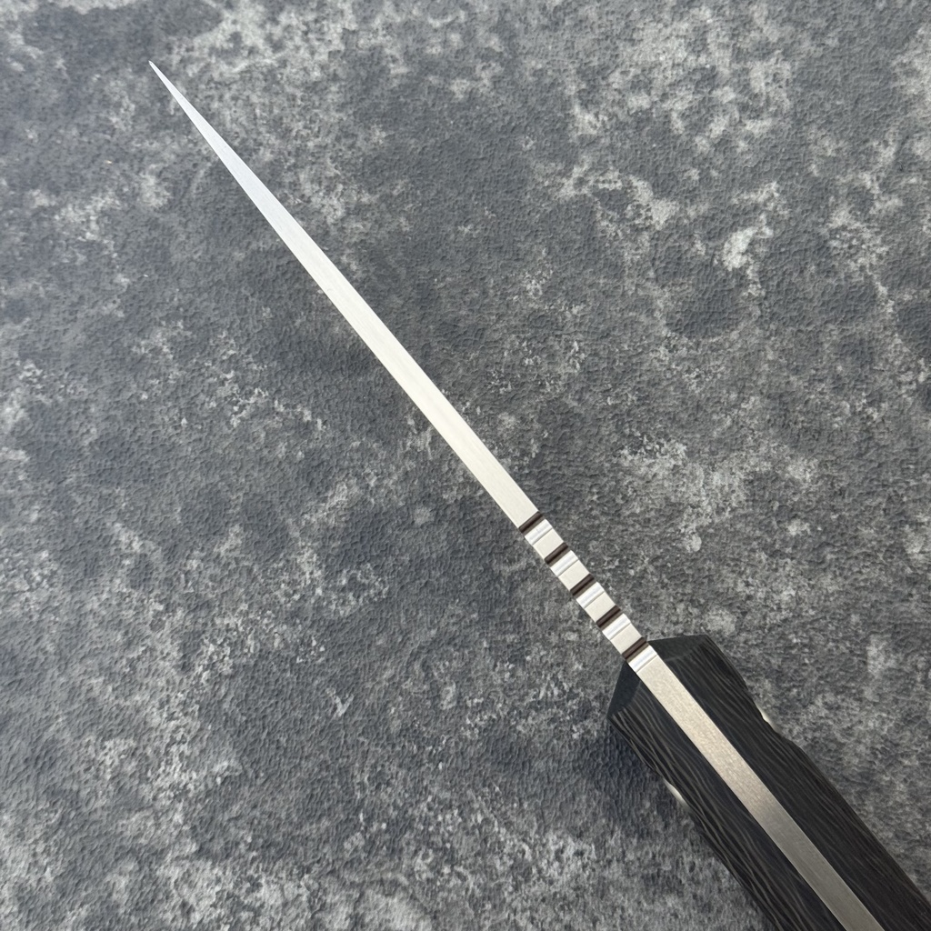 The handle linings are made of elegant carbon fiber. The material is resistant to moisture, temperature changes, most solvents and acids, and has high resistance to mechanical damage. The handle covers have been screwed with steel screws with a finish consistent with the finish of the blade (M5 screws are also hand-finished).