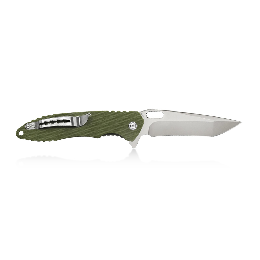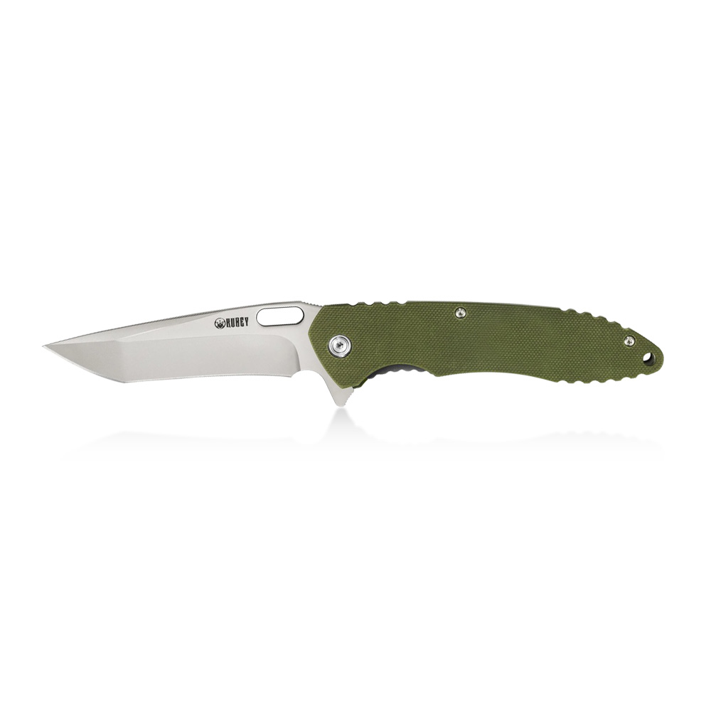 The Kubey Darkness KU003B folding knife has a powerful tanto blade made of Japanese AUS-10 steel. The handle of the knife is made of green G10 composite. The knife is opened due to the protruding flipper and the blade is blocked by a liner lock.