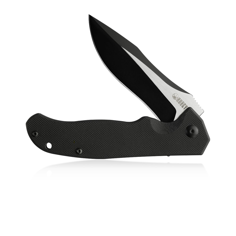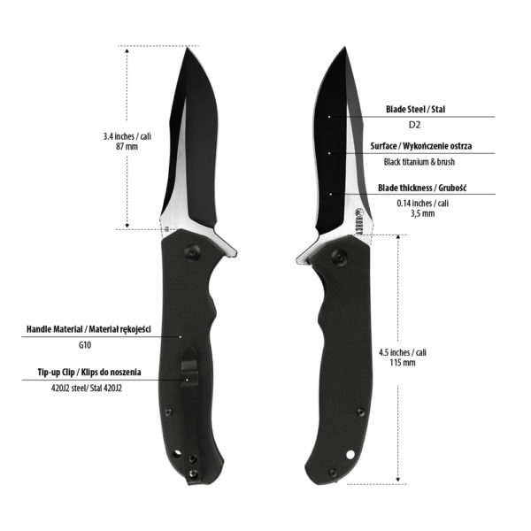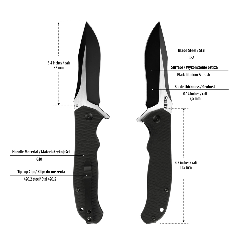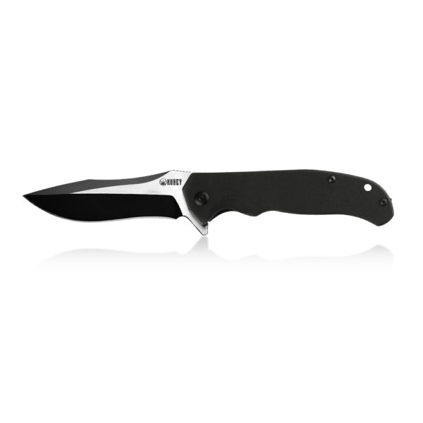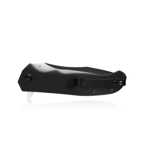 The presented Kubey Nuovo 162A folding knife has a drop point blade made of D2 steel, known for its cutting efficiency and easy to sharpen and maintain. The blade is partially finished in the form of brushed steel, and mostly has a black titanium coating. The handle of the knife is made of black G10 composite. The knife is opened due to the protruding flipper and the blade is blocked by a liner lock.
