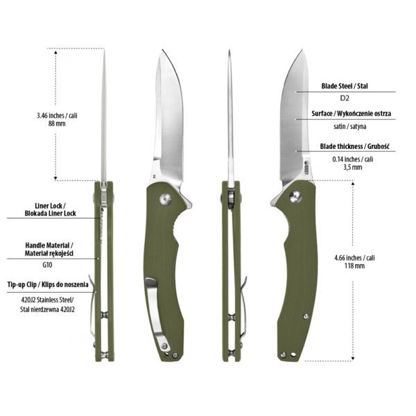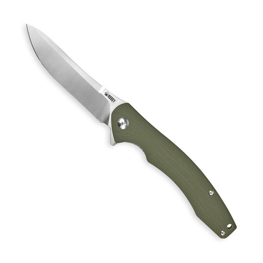 The Kubey Pretender KU178 folding knife has an efficient drop point blade made of D2 steel known for its cutting efficiency and easy to sharpen and maintain. The handle of the knife is made of green G10 composite. The knife is opened due to the protruding flipper and the blade is blocked by a liner lock.
