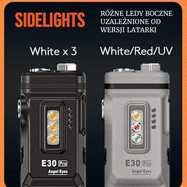 Latarka RovyVon Angel Eyes E30 Pro 7000K SST-40 & Side Warm White x3 Black EDC Taktyczna Akumulator 3500 Lumenów to solidne żródło światła o maksymalnej mocy aż 3500 lumenów. E30 Pro to propozycja nie tylko dla służb mundurowych, ale również dla użytkowników ceniących w użytku codziennym, w trakcie wypraw, biwaków i wędrówek wydajną moc świetlną oraz wytrzymałość akumulatora. W porównaniu do wersji podstawowej (Latarka E30) prezentowana wersja posiada mocniejsze diody frontowe i światło boczne w postaci 3 diod o ciepłej barwie białej (Warm White) oraz wydajniejszy akumulator.