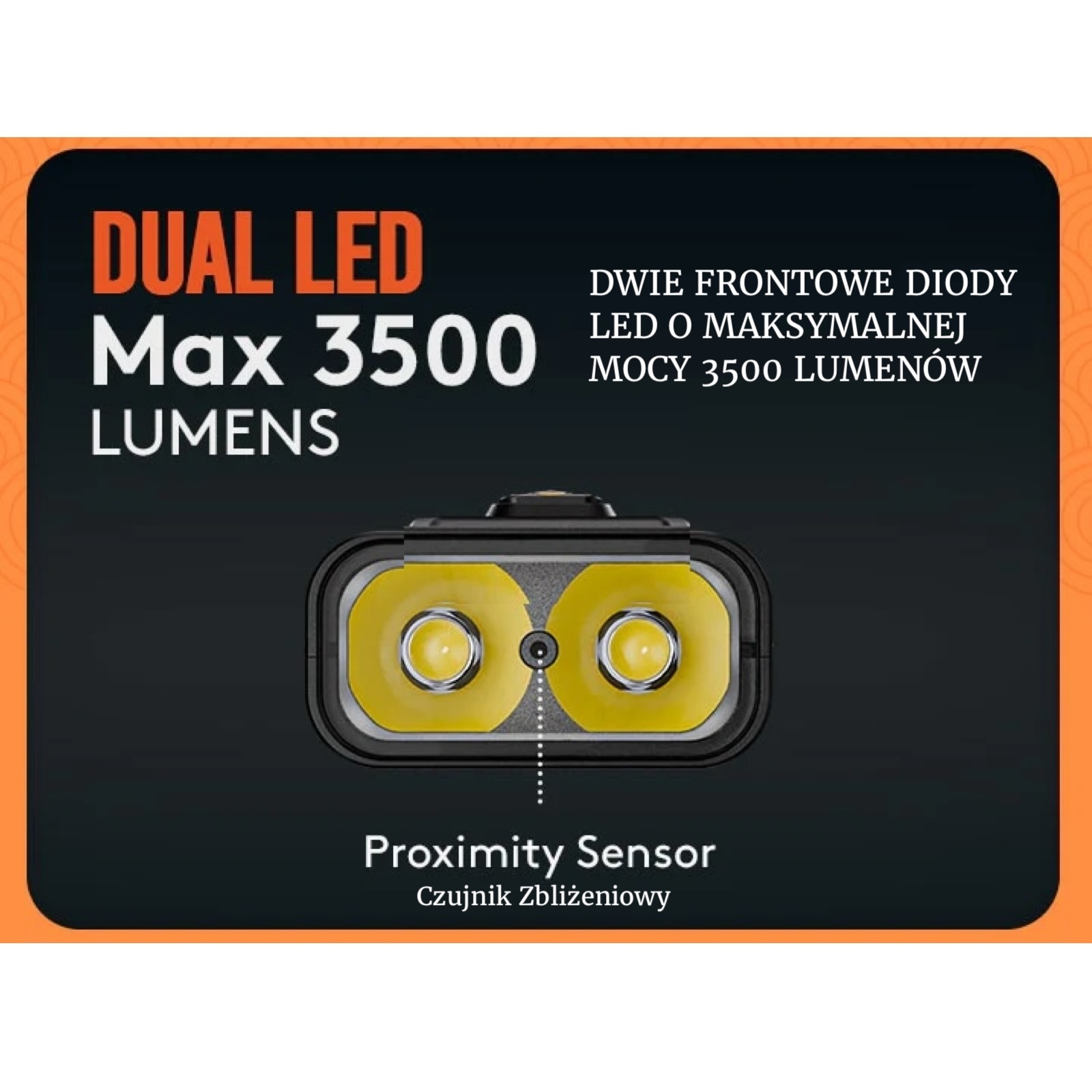 Czujnik zbliżeniowy. W warunkach słabego oświetlenia dostępny czujnik zbliżeniowy pomaga zachować naturalne widzenie w nocy, automatycznie przyciemniając światło, gdy znajduje się ono blisko powierzchni. Funkcję tę można zablokować jeżeli nie jest akurat potrzebna. Funkcja nie tylko wyróżnia latarkę na tle produktów innych marek, ale wydłuża również żywotność akumulatora.