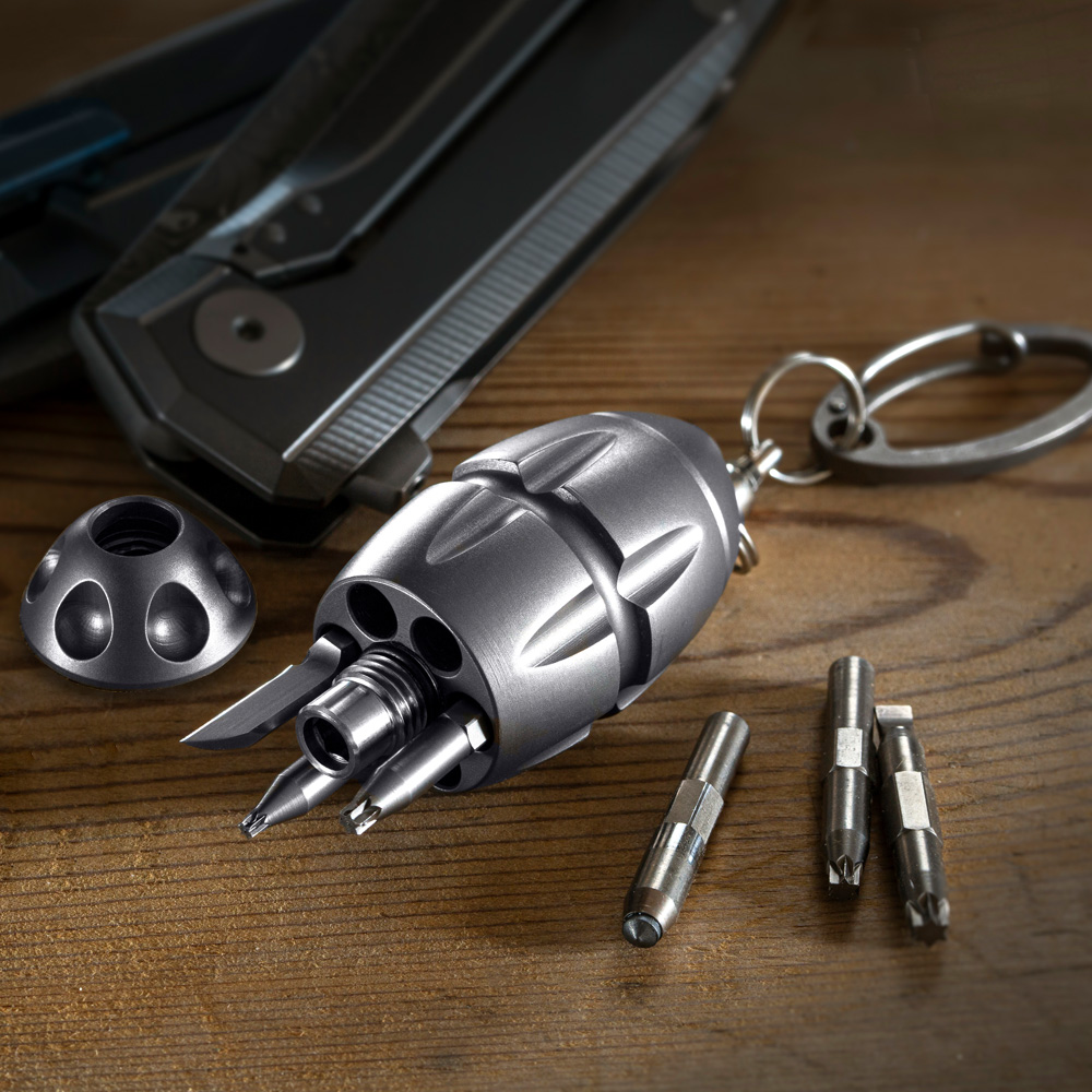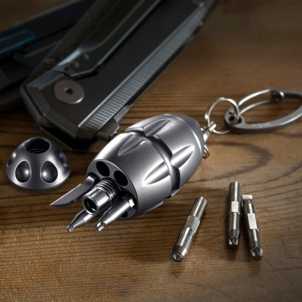 LionSTEEL Eggie EG-GY Multitool Keychain is made of gray titanium with an oval construction, creating the tool handle during the work and the bits inside are made of stainless steel. The set includes 4 sizes torx screwdrivers (T6, T8, T10+T15), a flat screwdriver, a glass breaker and a blade that can be freely replaced in the magnetic handle socket and a carabiner that can be disassembled and become a tool itself.