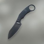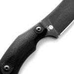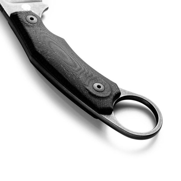 The handle is made of contoured Solid® Black G10. It’s one pice of machined G10. This improves comfort and grip because the fingers do not hit any joints or irregularities. It has a finger groove to prevent the hand from slipping over the cutting edge during work and a back ring in karambit style. The rounded spine of the blade is continued also on the handle.
