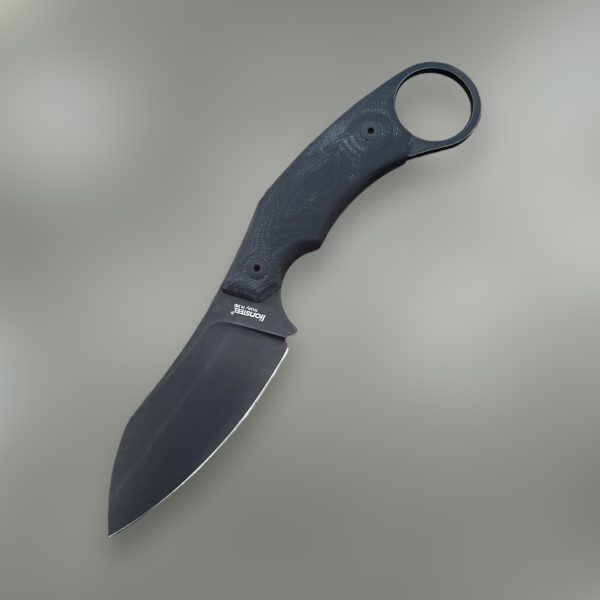 - Blade: fixed blade (full tang); modified sheepsfoot style blade with flat grind, plain cutting edge