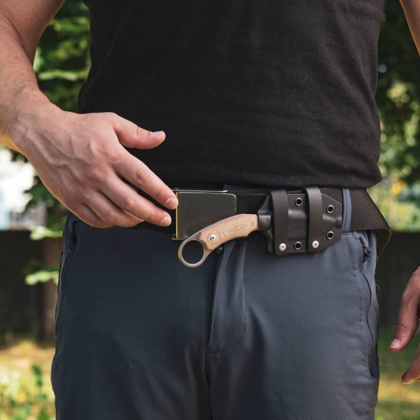 Included with the knife is a Kydex sheath. It features a set of straps (loops) for carrying the knife in virtually any position (vertical, horizontal, inverted). It is also compatible with MOLLE systems. The set includes a tool (KKR8) that allows for custom configuration of the sheath mounts and personalization of the knife carry.