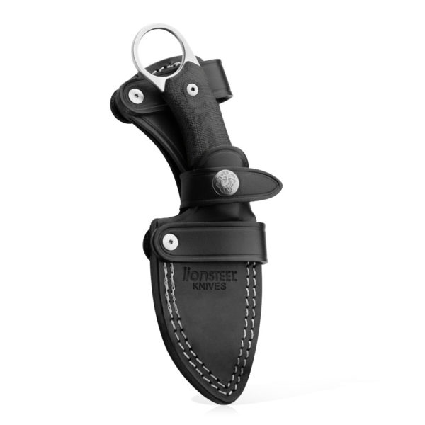 LionSTEEL H1 Stone Washed M390 Black G10 has a modified sheepsfoot blade, with a flat grind. The M390 steel blade has a stone wash finish. Solid® handle from one piece of black G10 and back ring allow for a comfortable, safe grip. The black leather knife sheath allows to carry the knife in choosen vertical or horizontan position and it is compatible with MOLLE systems.