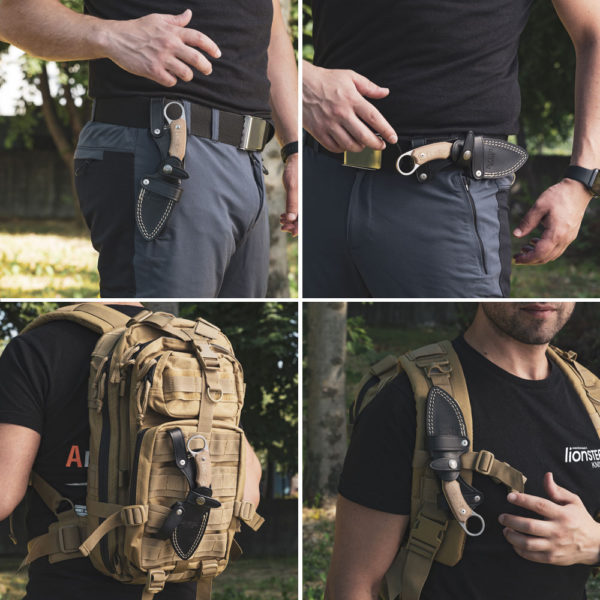 Knife comes with a leather sheath. It has a clasp around the handle of the knife with the manufacturer’s logo protecting against accidental protrusion and a set of short belts which allow to carry the knife in any position. It is also compatible with MOLLE systems. A tool (KKR8), included in the kit will allow to configure the sheath mounts and personalize the wearing of the knife. The sheath has been tastefully decorated with bright, strong stitches and an embossed manufacturer’s logo.