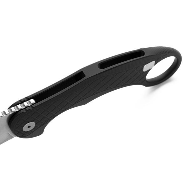 Tip-Up carrying clip located in front of the finger ring of the handle allows you to carry a knife in a pocket or clipped to a belt. The clip is made of steel. It is also possible to move the clip to the other side of the handle for left hand carry.