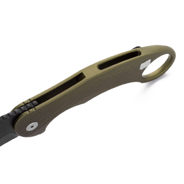 The handle of this unique folder is made of one piece of aluminum. It has no covers or attachment points. One piece of metal machined to fit a folded blade. This type of handle known as intergal, is the hallmark of the LionSTEEL brand. At the end of the handle we will find a characteristic for karambit knives, finger ring (back ring), which in this case is also an integral part of the handle. The handle it self is textured to improve grip.