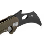 The blade of the knife was made in the style of howkbill and has a flat grind. The style in which the blade was made determines its optimal functionality and dedicates it to punctures, precision cuts or cuts in places with difficult access. The back of the blade has a comfortable thumb ramp on which the jimping is placed and then goes into Emerson Vawe, which allows you to open the knife when get from the pocket. The finish of the blade is the so-called chemical black, which matches the color of the design.