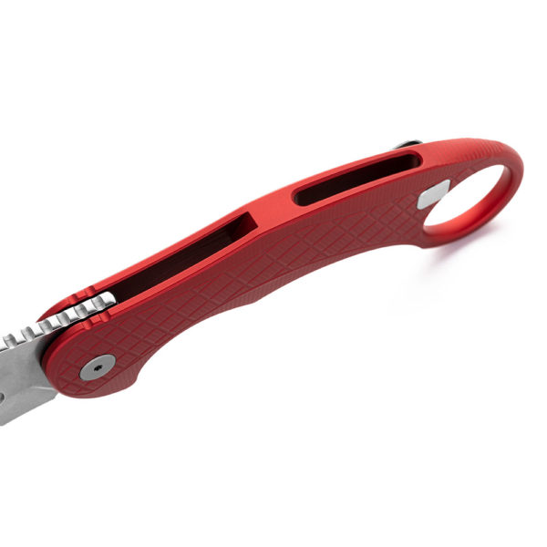 The handle of this unique folder is made of one piece of aluminum. It has no covers or attachment points. One piece of metal machined to fit a folded blade. This type of handle known as intergal, is the hallmark of the LionSTEEL brand. At the end of the handle we will find a characteristic for karambit knives, finger ring (back ring), which in this case is also an integral part of the handle. The handle it self is textured to improve grip.