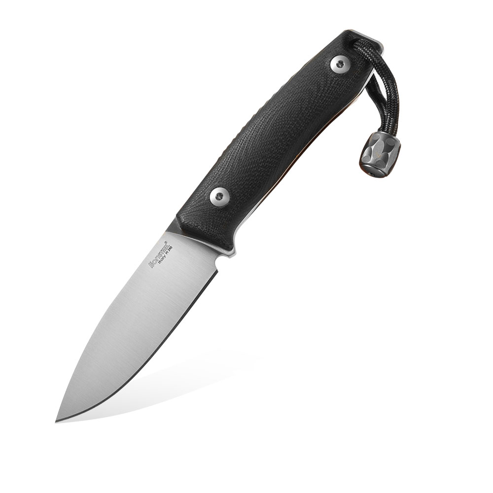 The handle is made of contoured G10 for better comfort. The rounded spine of the blade is continued also on the handle. The handle has a hole for a rope or paracord and a titanium bead (included).