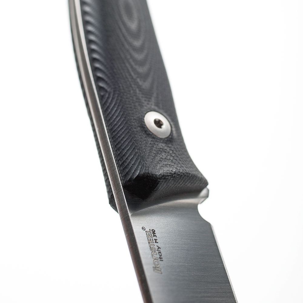The blade of the knife has a drop point profile with flat grind, very versatile in use, dedicated to any type of work. It has a vertical satin finish and gently rounded spine for better comfort in hard use.