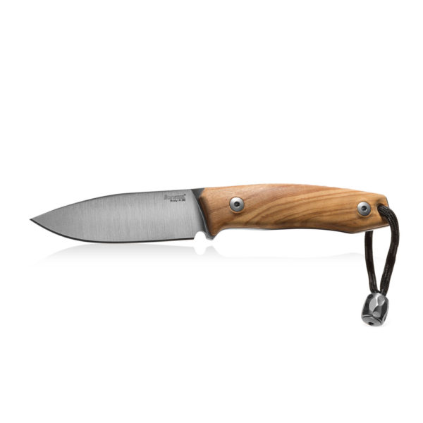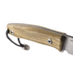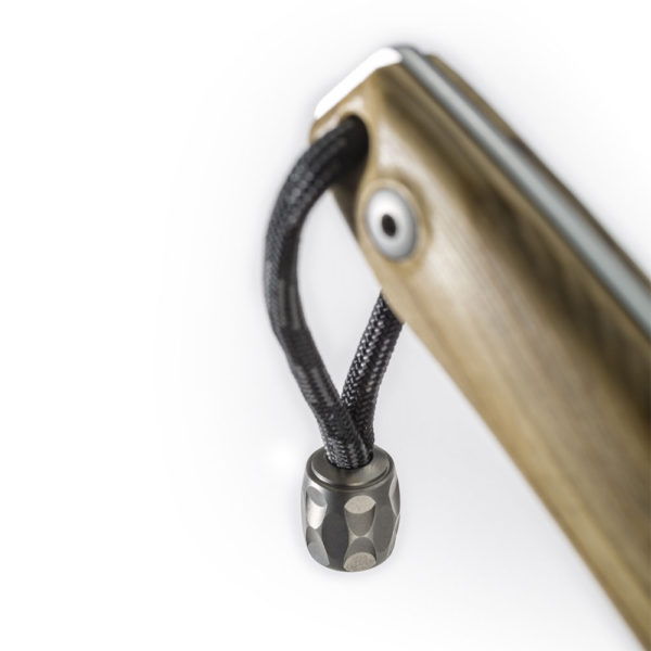 The handle is made of contoured Olive Wood for better comfort and premium feel. The rounded spine of the blade is continued also on the handle. The handle has a hole for a rope or paracord and a titanium bead (included).