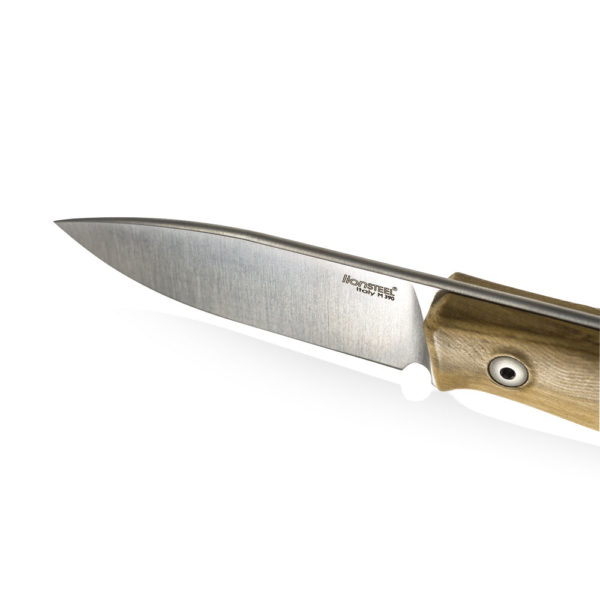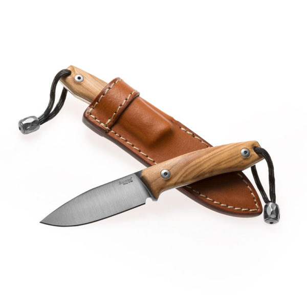 LionSTEEL M1 Olive Wood M390 by Molletta has a working drop point blade profile with a full flat grind. The M390 steel blade has a satin finish and the handle made of Olive Wood. The set includes a nicely made, decorated with stitching sheath made of brown leather and a titanium bead (TIP GY).