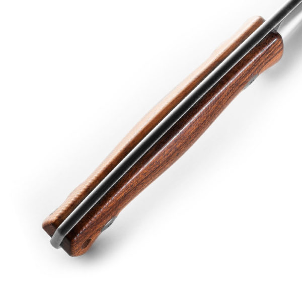 The handle is made of contoured Santos Wood. This improves comfort and grip. It has a finger groove to prevent the hand from slipping over the cutting edge during work and a glass breaker or hammer at the end. The rounded spine of the blade is continued also on the handle.