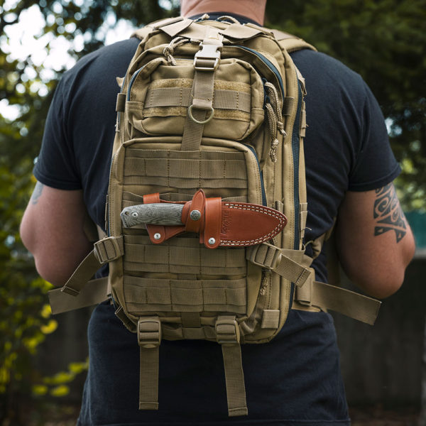 Knife comes with a leather sheath. It has a clasp around the handle of the knife with the manufacturer’s logo protecting against accidental protrusion and a set of short belts which allow to carry the knife in any position. It is also compatible with MOLLE systems. The sheath has been tastefully decorated with bright, strong stitches and an embossed manufacturer’s logo.