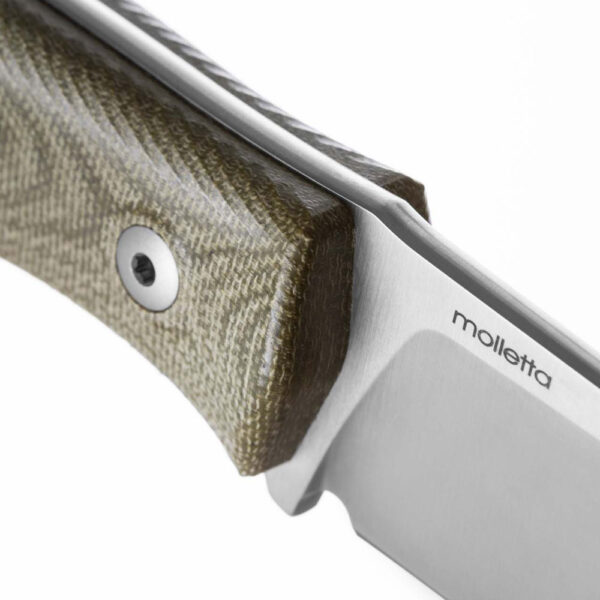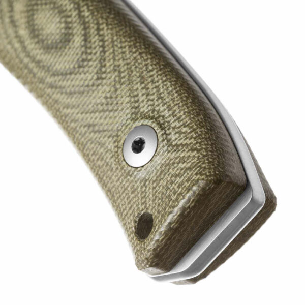 The handle is made of contoured Canvas Micarta Green. This improves comfort and grip. It has a finger guard to prevent the hand from slipping over the cutting edge during work and a glass breaker or hammer at the end. The rounded spine of the blade is continued also on the handle.