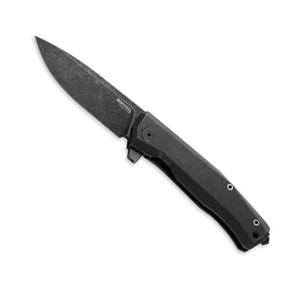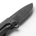 The knife is opened due to a subtly protruding from the blade, a removable flipper (fin). The knife unfolding is very easy and smooth thanks to the Double Crown system based on ball bearings. This system is an extension of the standard ball bearing and has two bearing rings for better blade stability and easier opening of the folder. The knife has a stable and durable frame lock protecting against accidental closing. A steel insert is placed in the titanium lock letter to increase the life of the locking mechanism. The insert also has a special tab to prevent the lock from being excessively pulled out of the handle (overtravel stop).