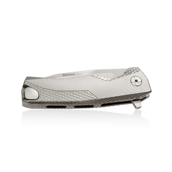 LionSTEEL ROK Solid ROK G Grey Titanium by Molletta Folding Knife has a satin drop point blade with a high flat grind, made of premium M390 steel. The flipper can be removed to open the knife with both hands, in the traditional way. The handle is made of grey anodized one piece of titanium (Solid). Locking the blade is a frame lock with a steel insert and additional ROTOBLOCK protection and convenient carrying of the knife is possible thank to an innovative, retractable clip (H.WAYL).