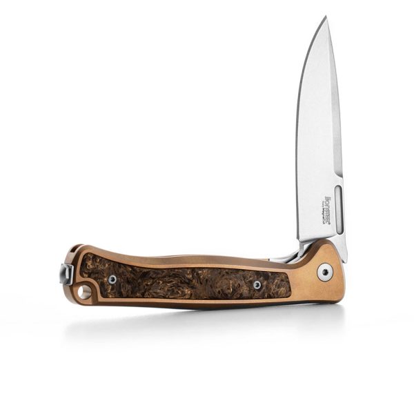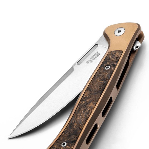 - Rękojeść: tytanowa (titanium 6AI4V), frezowana, kolor brązowy (bronze), wstawka z włókna węglowego (carbon fiber), obustronny stalowy klips mocujący (Tip-Up, Deep Carry)