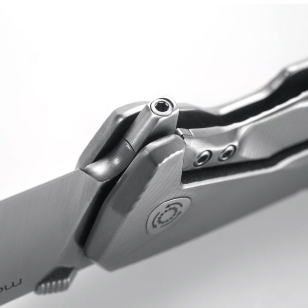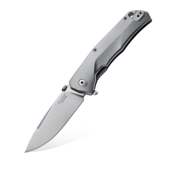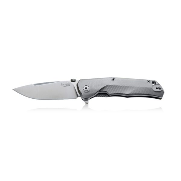 The knife is opened due to a subtly protruding from the blade, a removable flipper and thumb disc. The knife unfolding is very easy and smooth thanks to the ball bearings. The knife has a stable and durable frame lock protecting against accidental closing. A steel insert is placed in the titanium lock letter to increase the life of the locking mechanism. The insert also has a special tab to prevent the lock from being excessively pulled out of the handle (overtravel stop).