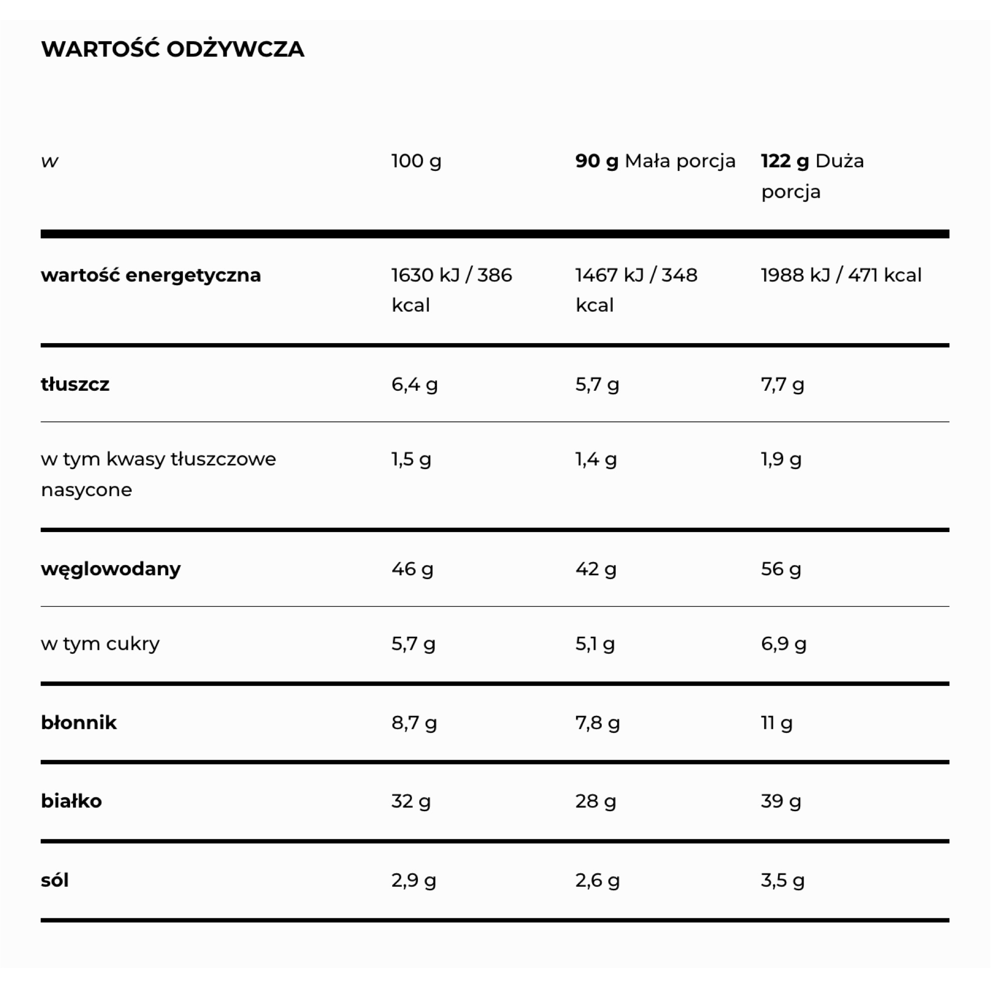 • Wartość energetyczna porcji 90 g: 1467 kJ / 348 kcal