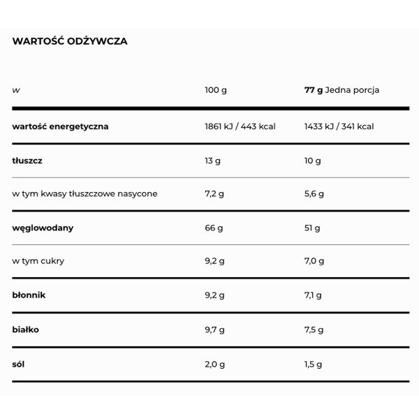 • Wartość energetyczna porcji 77 g: 1433 kJ / 341 kcal