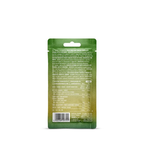 Składniki produktu gotowego do spożycia: liofilizowane owoce w proszku (jabłko 36,6 %, kiwi 36,6 %, ananas 20 %), szpinak 3 %, pokrzywa 3 %, imbir 0,8 %.