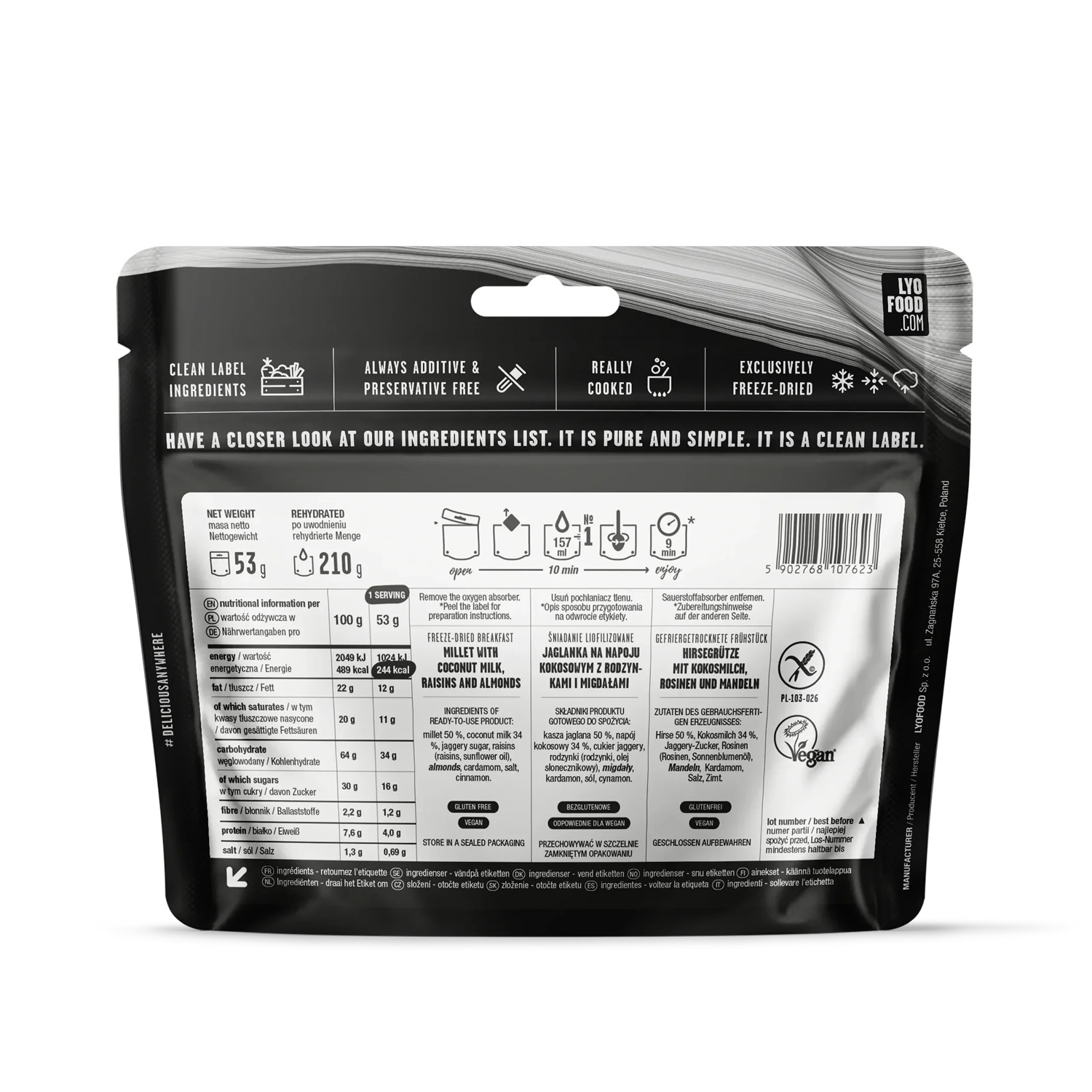 Lyofood Millet Payasam Freeze-dried breakfast: Millet with coconut milk, raisins and almonds