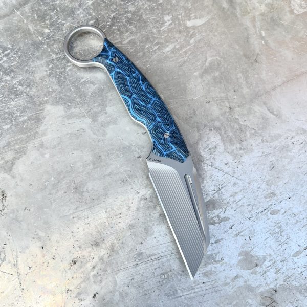 - Blade: fixed blade (full tang), karambit style with groove grind, plain cutting edge