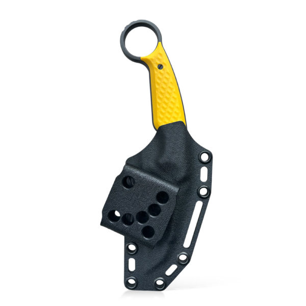 Presented MK Knives & Tools Claw “Bumblebee” has a blade made of premium Elmax steel, with innovating hollow grind (characteristic grooves on the blade) and fuller. Blade was covered by excellent DLC coating. Handle scales are made of yellow G10 composite. The knife has a black kydex holster. Kydex can be mounted vertically or horizontally or at a selected angle thanks to a specially adapted kydex buckle.