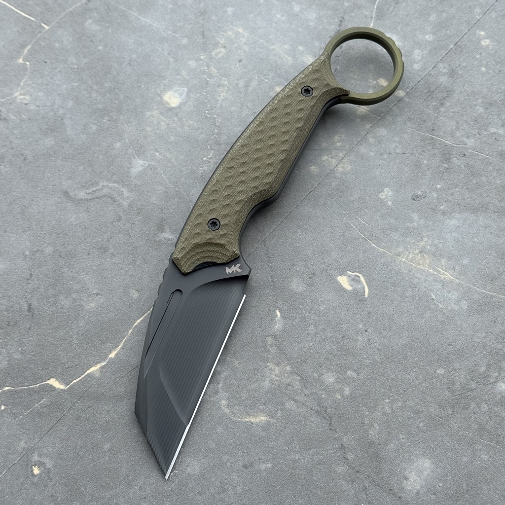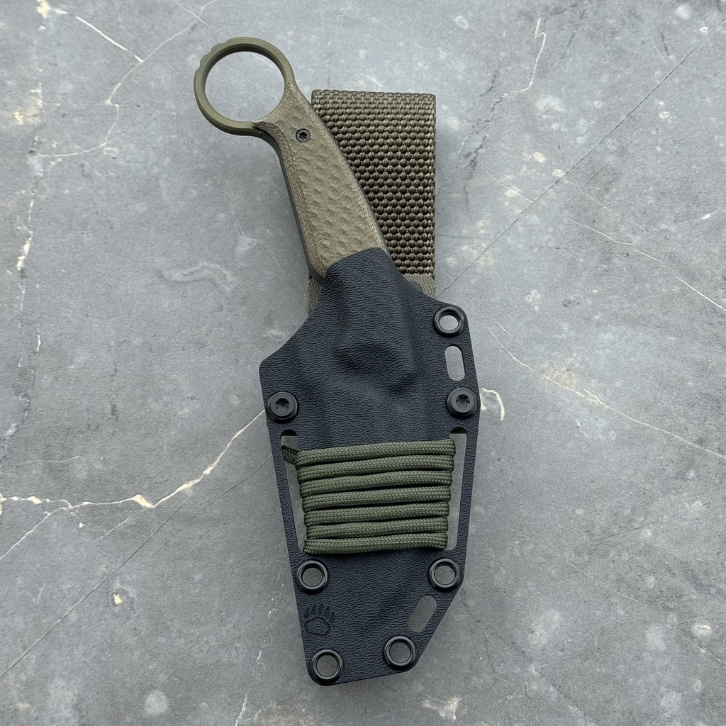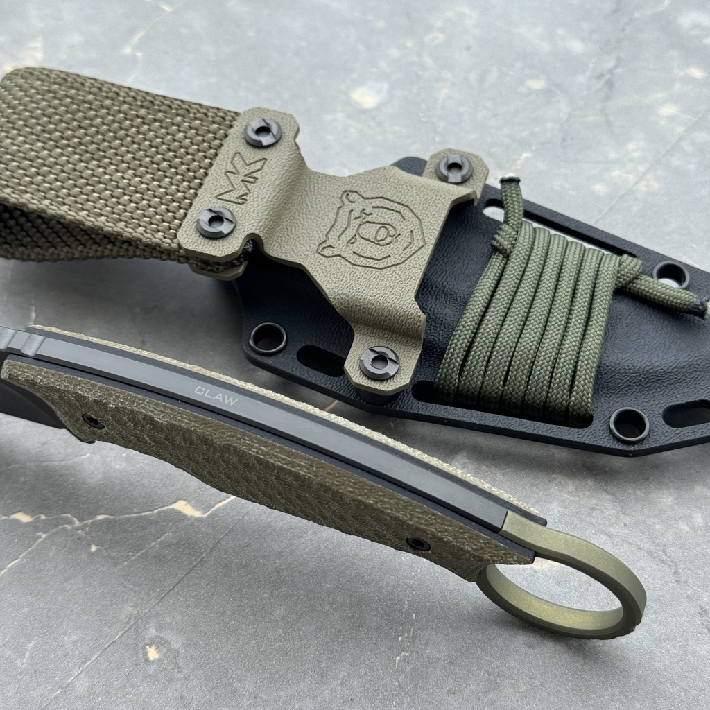MK Knives & Tools Claw “Fear The Bear” DLC Vanadis 23 & Titanium Figner Ring Green Canvas Micarta & Black G10 Black Kydex