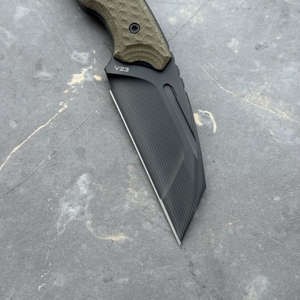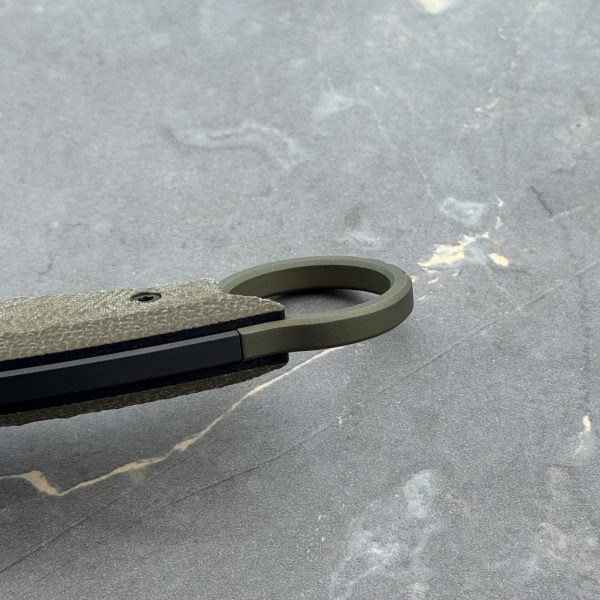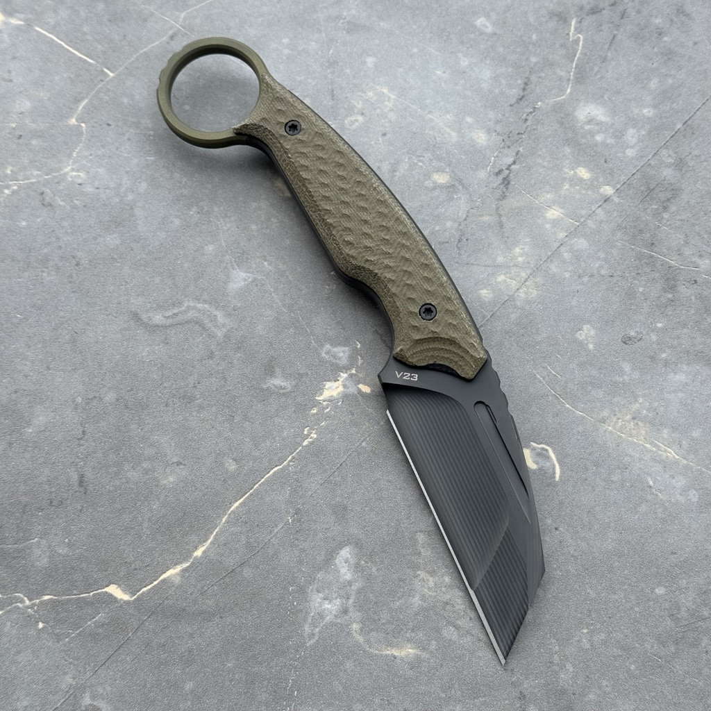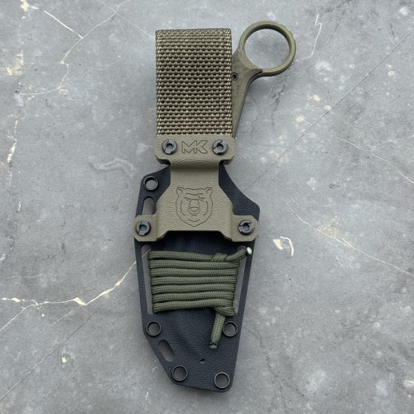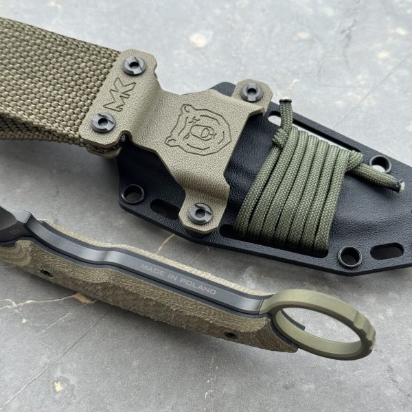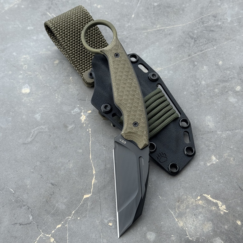 MK Knives & Tools Claw “Fear The Bear” DLC Vanadis 23 & Titanium Figner Ring Green Canvas Micarta & Black G10 Black Kydex