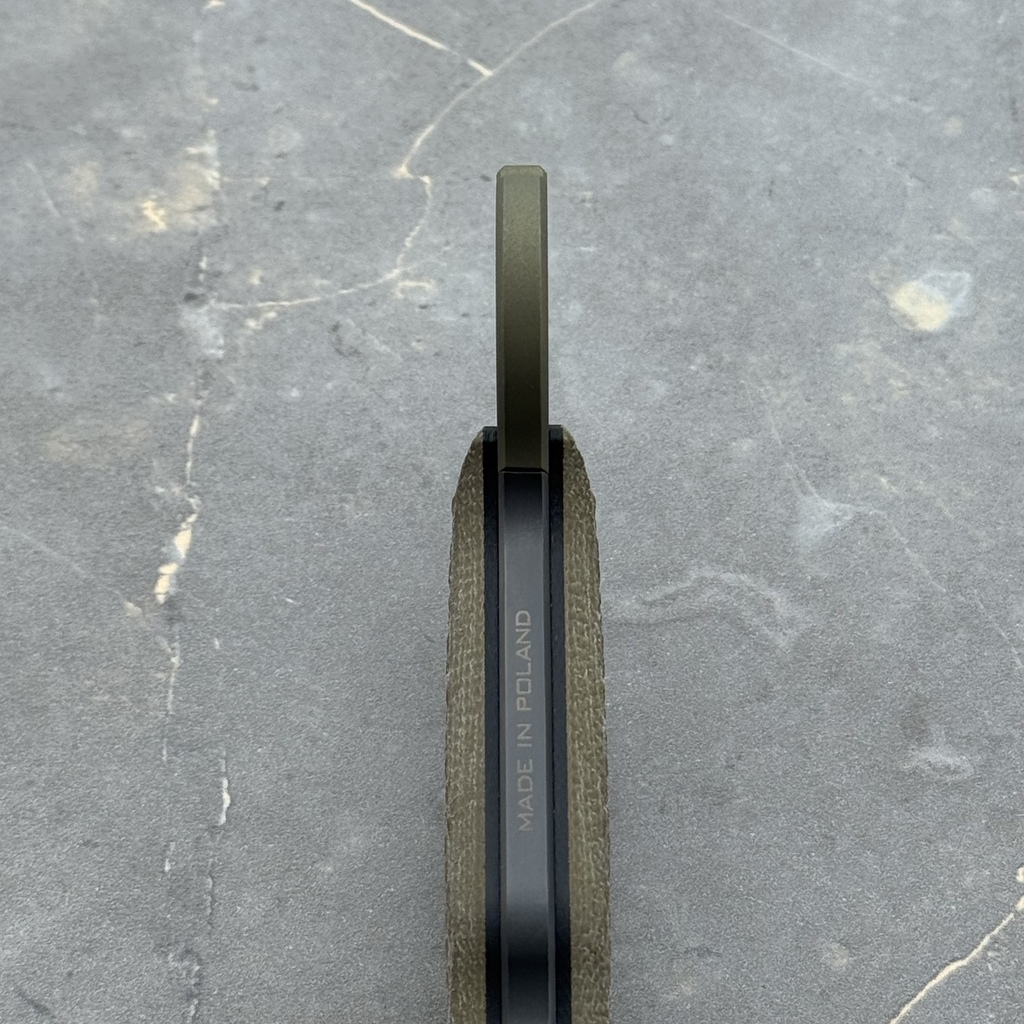 **HANDLE MATERIALS**. The handle scales are made from Micarta and G10. Both laminates are created using epoxy resin, but they differ in their base materials—Micarta is made with canvas, while G10 is reinforced with fiberglass. In both cases, the materials are produced by compressing the base material and epoxy resin under high pressure. Micarta and G10 are highly resistant to moisture, temperature changes, most solvents and acids, and offer excellent durability against mechanical damage. The scales are attached with sturdy Torx screws, which blend seamlessly with the knife’s design.